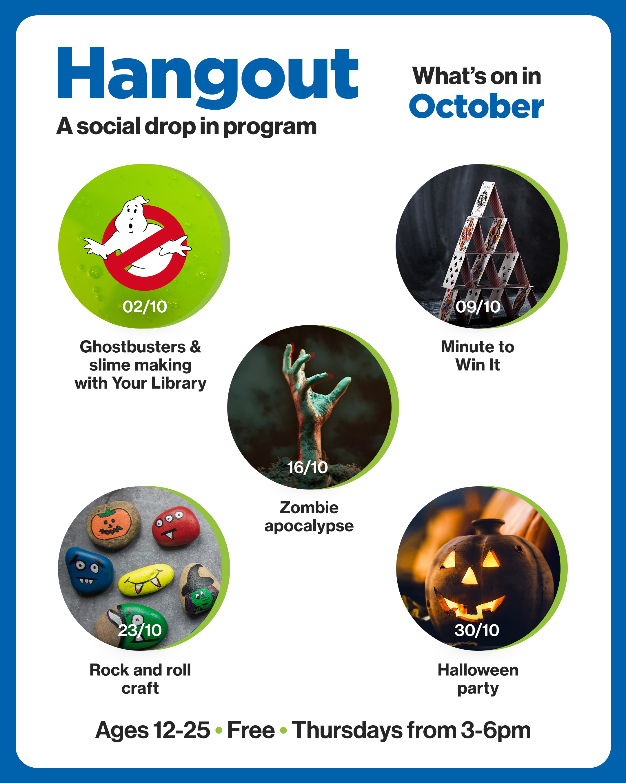 Halloween party at Hangout 30 Oct 2025 Join our Youth Workers for a free social drop-in program every Thursday afternoon. This Thursday come down and join us for a spooky Halloween party! Feel free to come dressed up in your favourite scary costume and take part in a variety of fun and spooky games. Croydon Community Hub, Unit 4, 7 Civic Square, Croydon 3136 Tagged as: , Children & families, Community, Council run event, Health & Wellbeing, LGBTIQA, Youth events