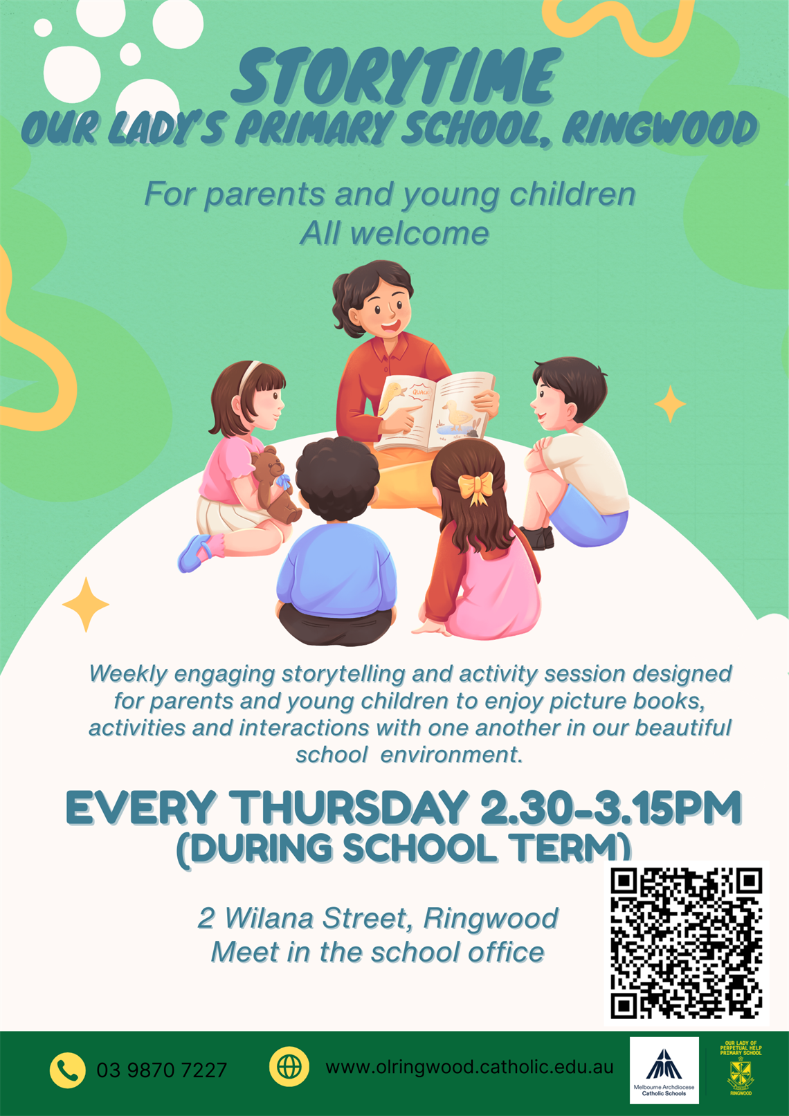 Weekly engaging storytelling and activity session designed for parents and young children to enjoy picture books, activities and interactions with one another in our beautiful school environment.
